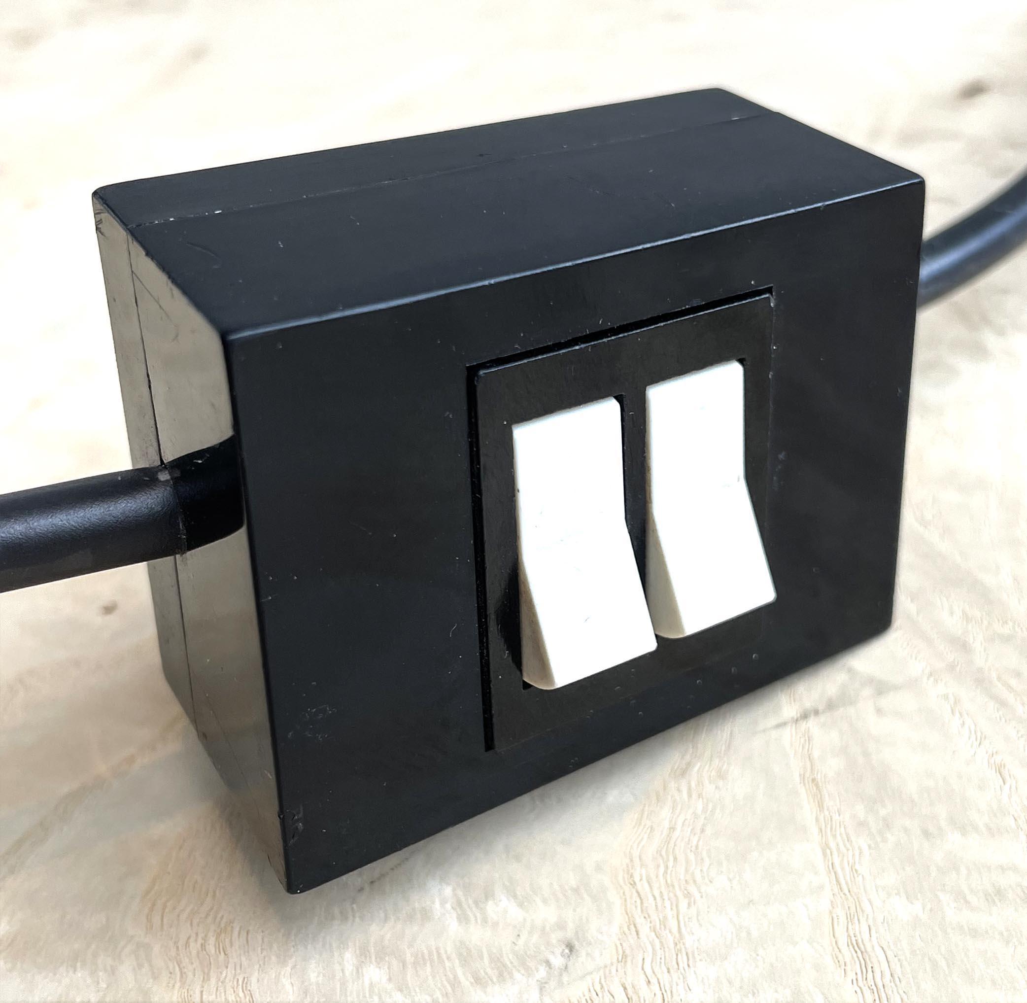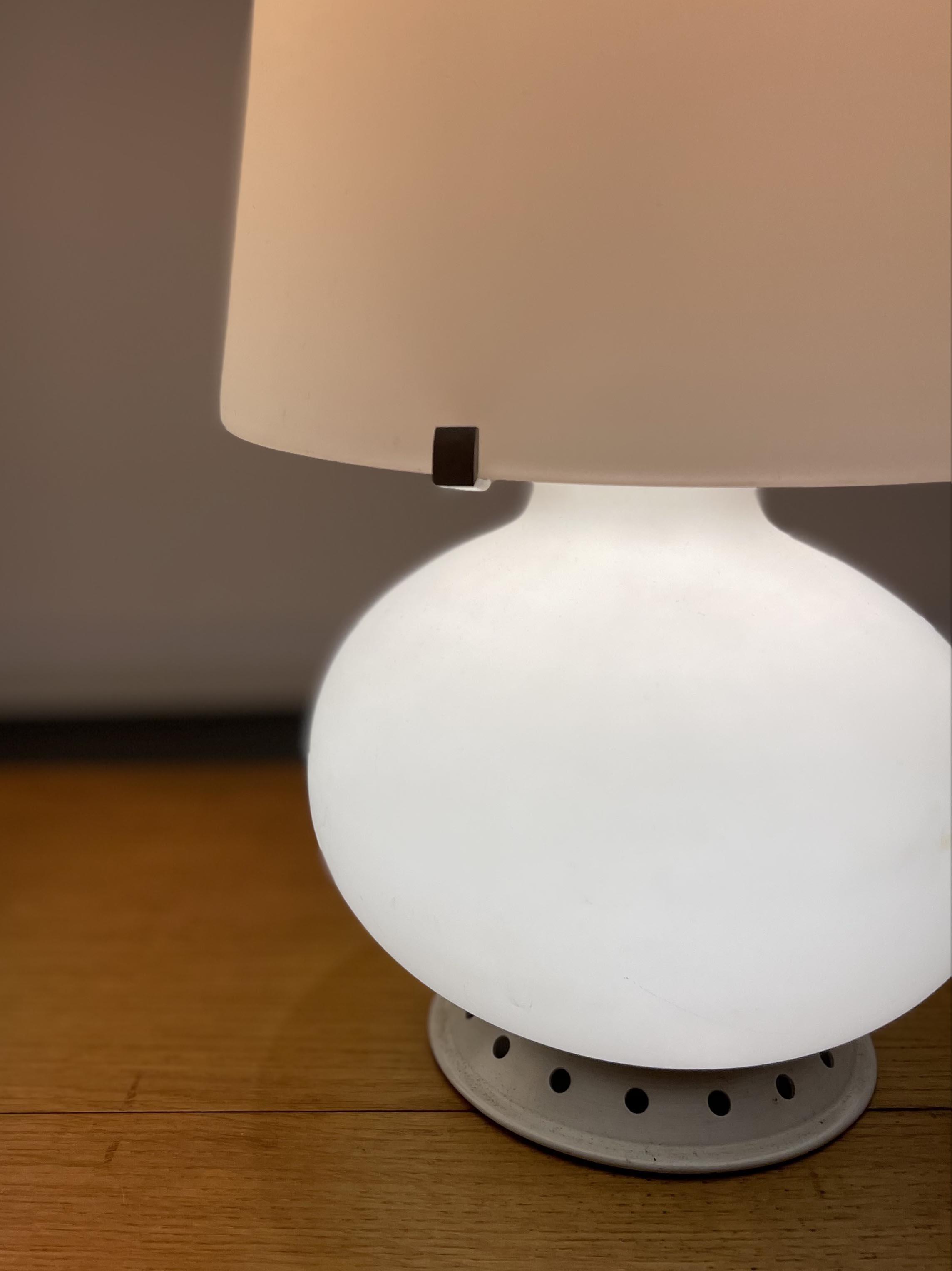 Frosted glass and painted metal bases with light fittings in both shade and base, including original stamped duplex switch box